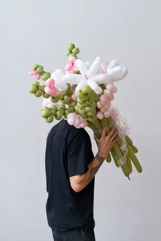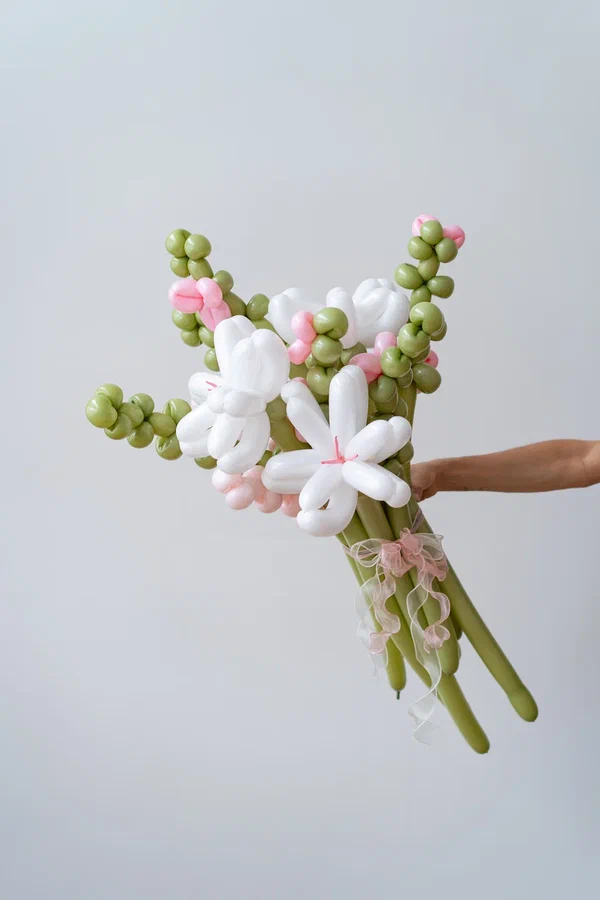 Форма и структура:букет состоит из объёмных «цветов», выполненных из белых и нежно-розовых шаров, которые напоминают бутоны и лепестки. Зелёные шары формируют «стебли» и «веточки», создавая эффект живых растений.