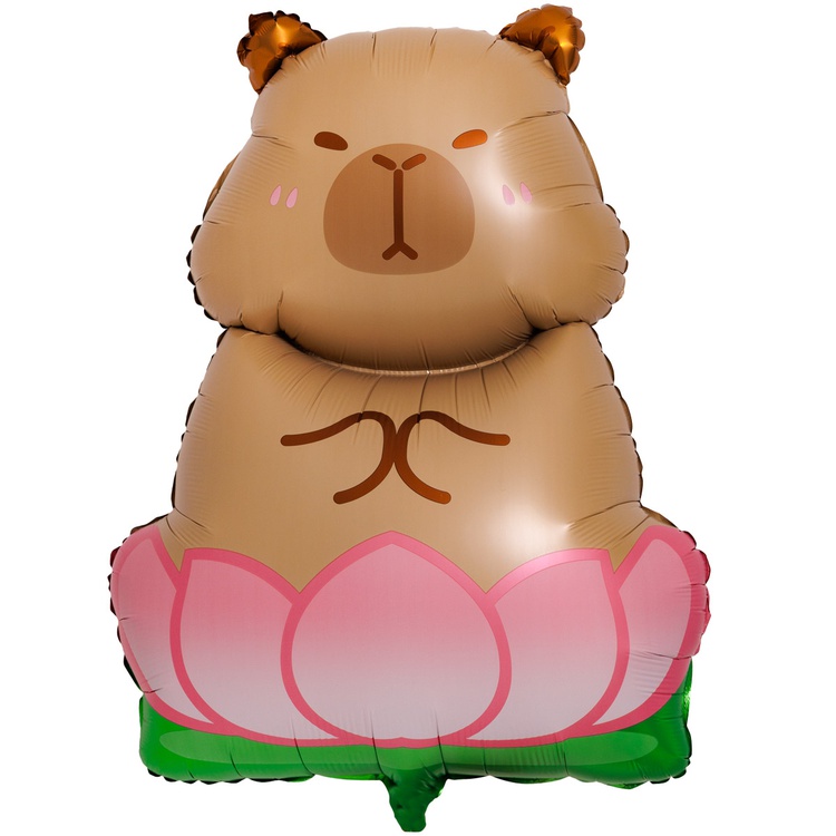 Фигурный фольгированный шар в форме очаровательной капибары в цветке лотоса. Такой необычный шар зарядит любой праздник позитивом! Рекомендуется надувать гелием — так фигура будет держать форму и парить в воздухе, создавая волшебную атмосферу. Имеет встроенный клапан -что упрощает надувание. Шар изготовлен из качественных материалов (полимерная фольгированная пленка)