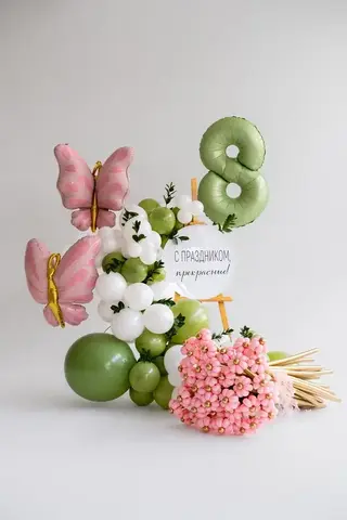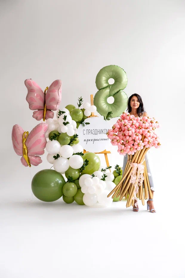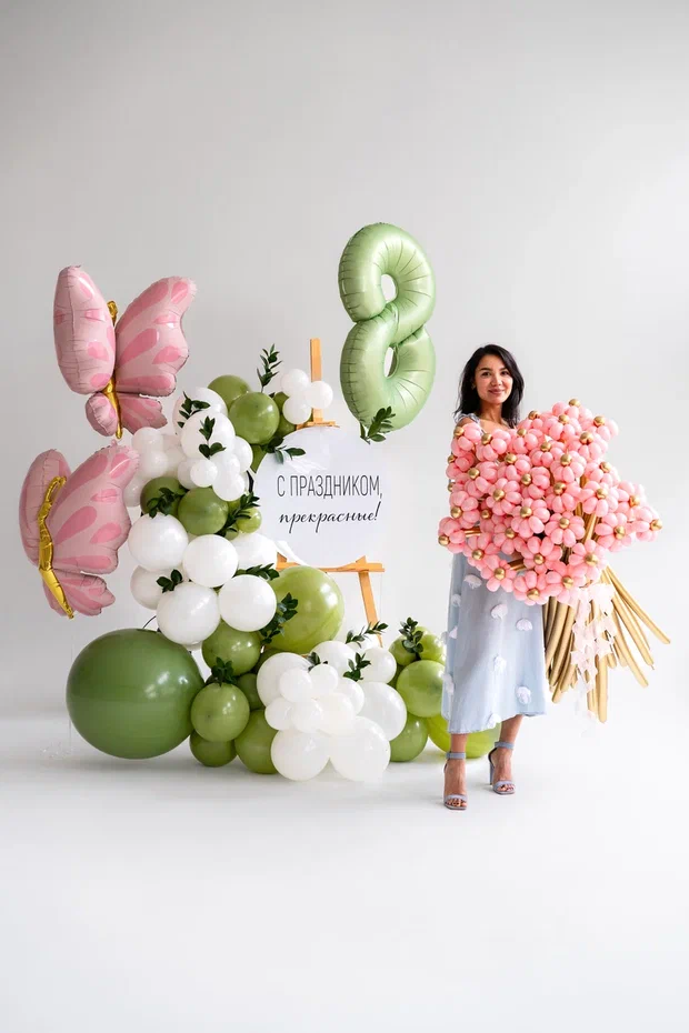 Большой фольгированный шар в форме цифры «8» (зелёного цвета) — расположен справа от арки. Является ярким акцентом и может указывать на тематику праздника (например, 8 Марта).