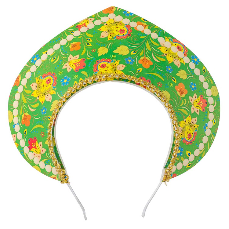 Карнавальный головной убор. Кокошник зеленого цвета закреплен на ободке, идеально подойдет в качестве праздничного головного убора на Масленицу.