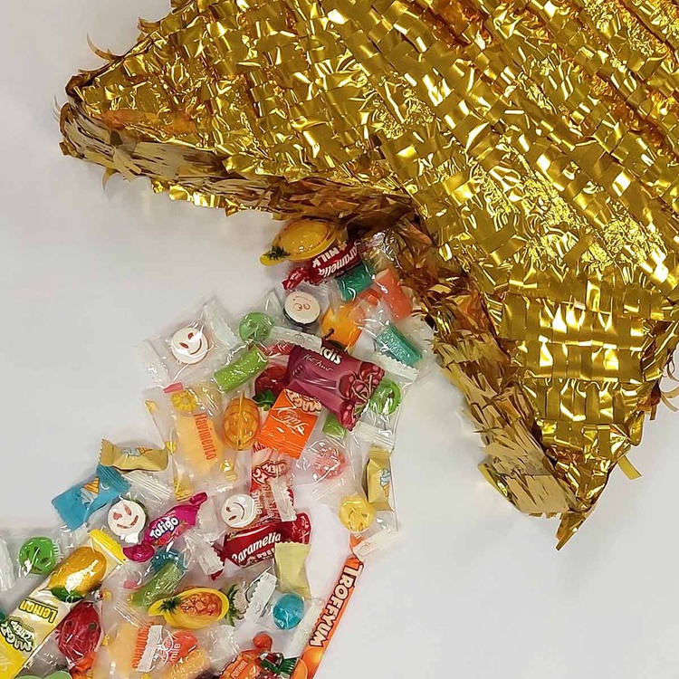 Набор сладостей для наполнения Пиньяты. В пиньяту кладут различные угощения, игрушки, конфетти и подвешивают к потолку или на дерево. При игре в традиционную пиньяту участнику завязывают глаза, раскручивают, и затем он пытается за несколько попыток найти и разбить пиньяту из которой разноцветной россыпью высыпается содержимое. Данный набор состоит из жевательных тянучек и резинок, кислых мармеладных трубочек, шариков с шипучкой вкуса ванильного мороженого, фруктовых пастилок и мягких ирисок, цветных карамелек в виде смайликов, а также много других вкусных и ярких конфет вы найдете в данном наборе. Вес набора 400гр.