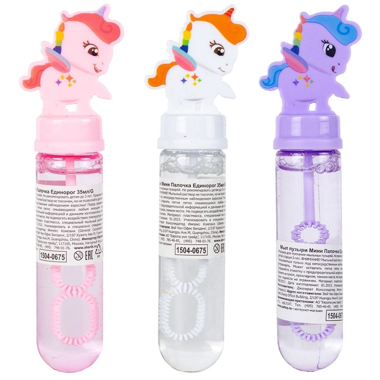 Мыльные пузыри с игрушкой в форме единорога. Объем мыльного раствора 35мл. Размер палочки 14см.