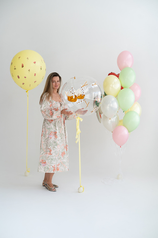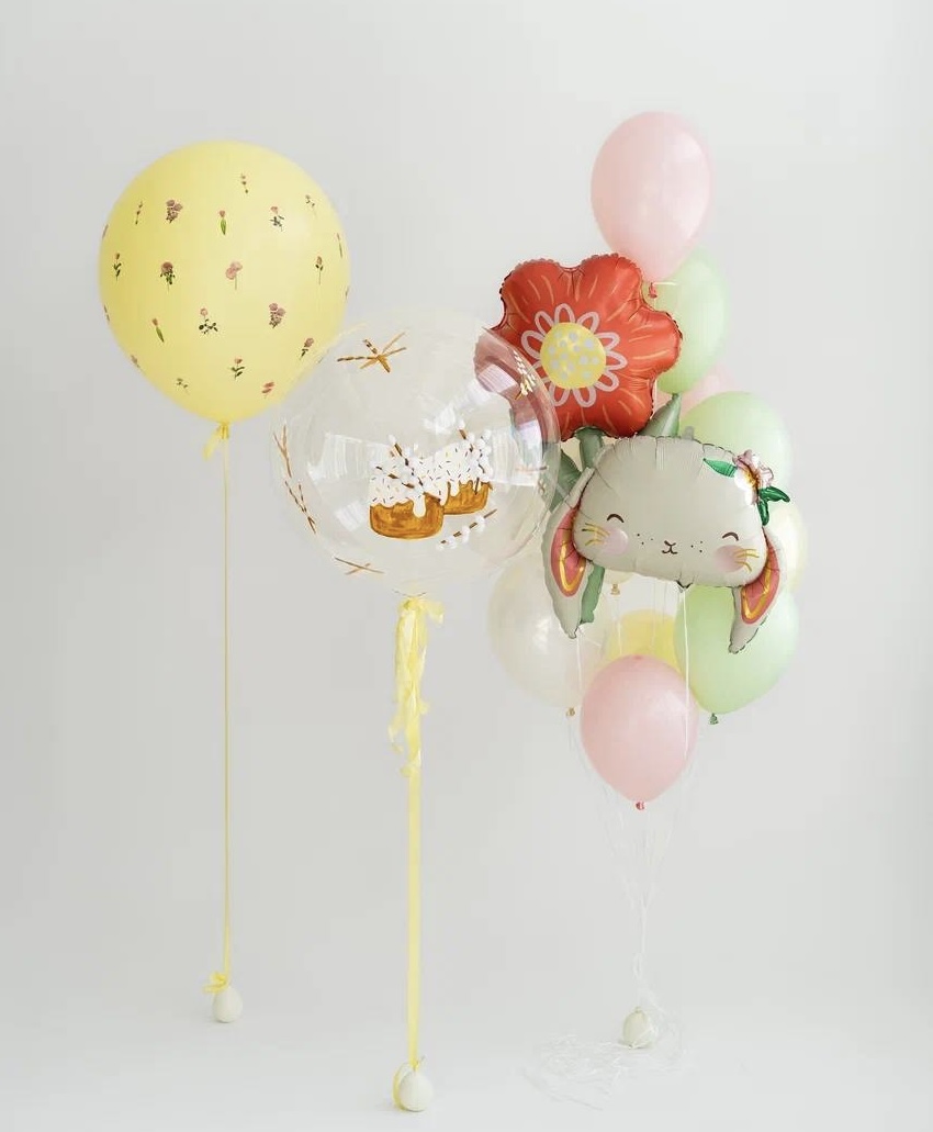 Эта мило-нежная композиция разделена на две части: отдельно на грузик и в связку. Палитра сочетает нежно-желтый с акцентами светло-розового и мятного, создавая ощущение праздника и радости. В центре внимания — шар на грузике с милыми цветочными наклейками и декоративным баблсом с ручной росписью. В связке присутствуют очаровательные детали: голова зайчика и цветочек, дополненные набором стандартных шаров. Состав: Отдельно на грузик: шар 70 см нежно-желтый наклейки цветочки на шар баблс с ручной росписью В связку: голова зайчика цветочек 4 стандарт стеклянных шара 7 стандартных шаров