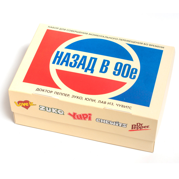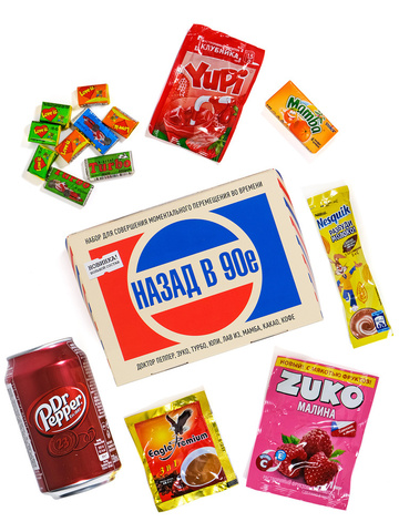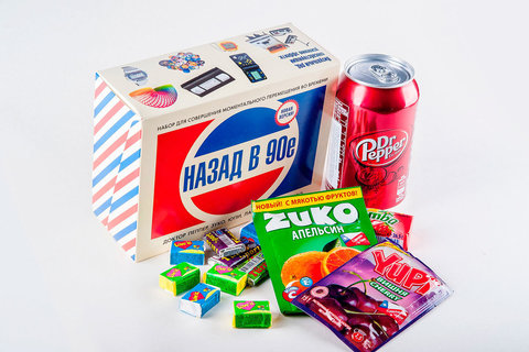 Хватайте, ностальгируйте, наслаждайтесь! В набор «Назад в 90-е», купить который вы можете одним кликом, входят потрясающие штуки: банка бельгийского Dr. Pepper, жевательная конфета «Mamba» , разноцветные Yupi и Zuko и, конечно же, жвачка Love is… «Назад в 90 е» – коробка сладкой ностальгии!