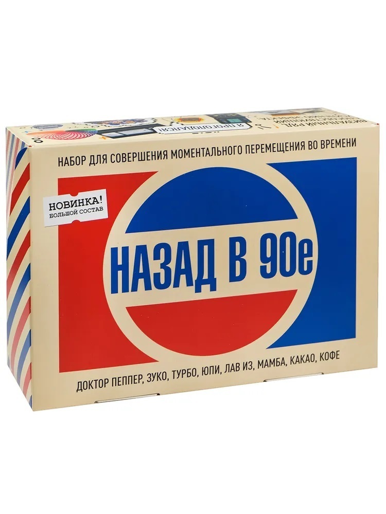 «Назад в 90» – набор, который можно подарить в подарок каждому, кто с ностальгией вспоминает об эпохе первых иностранных вкусностей. «Назад в 90» – набор, который можно купить самому себе. «Назад в 90 е» – это уже легенда! Погрузитесь в воспоминания о беззаботном детстве и нежной юности.
