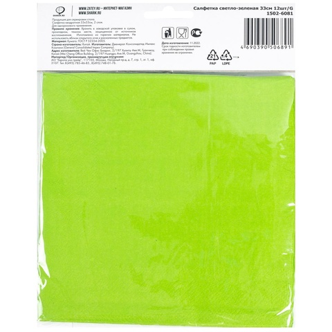 Обратный звонокСветло-зеленая двухслойная салфетка 33х33см, 12 штук в упаковке. Используется совместно с другими элементами коллекции (тарелки ,стаканы, скатерть) как украшение стола или по своему непосредственному назначению.