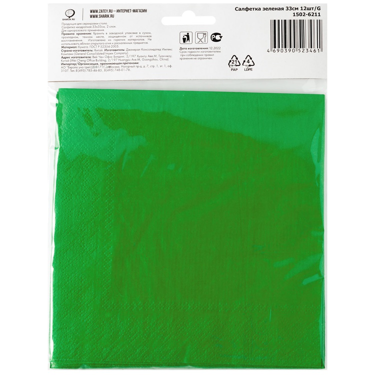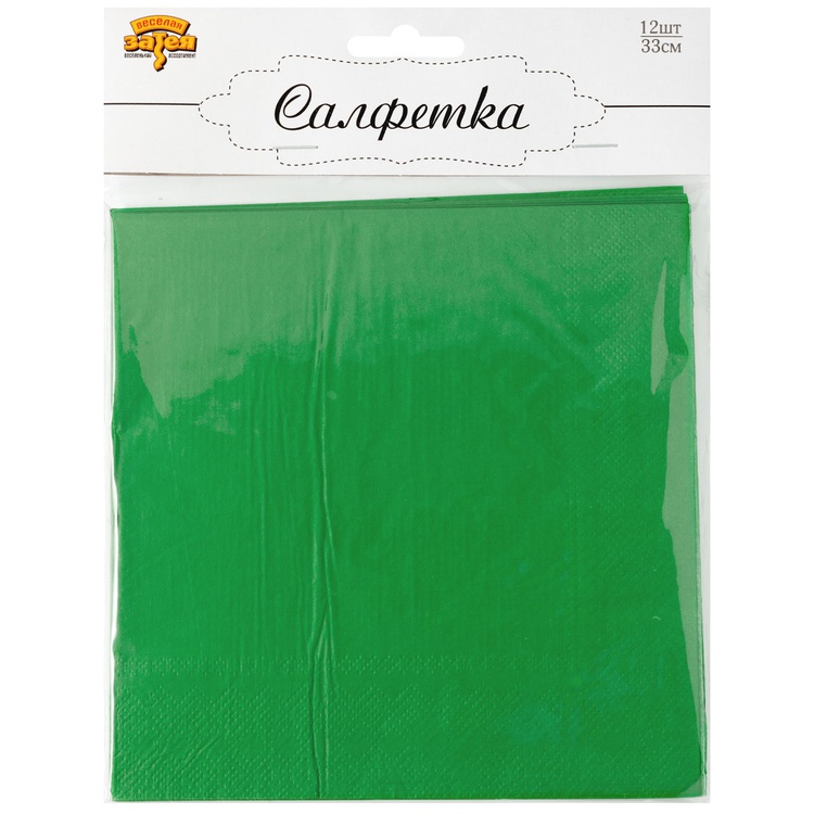 Обратный звонокЗеленая двухслойная салфетка 33х33см, 12 штук в упаковке. Используется совместно с другими элементами коллекции (тарелки ,стаканы, скатерть) как украшение стола или по своему непосредственному назначению.