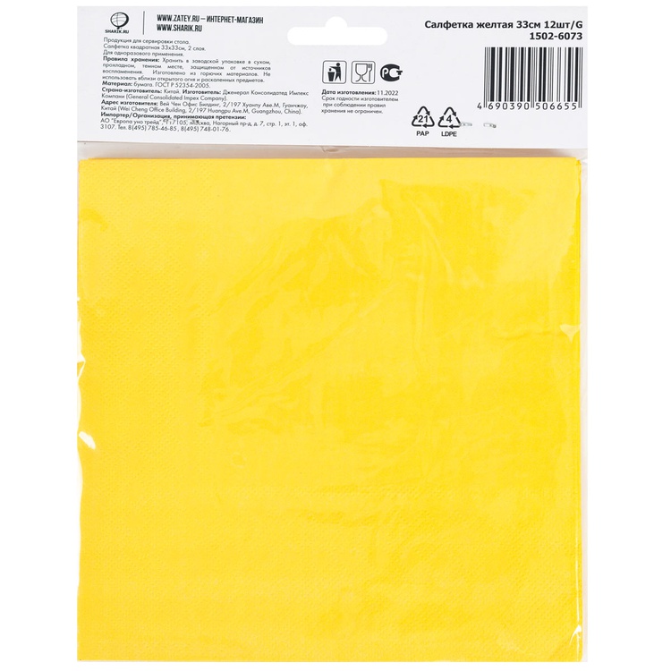 Обратный звонокЖелтая двухслойная салфетка 33х33см, 12 штук в упаковке. Используется совместно с другими элементами коллекции (тарелки ,стаканы, скатерть) как украшение стола или по своему непосредственному назначению.