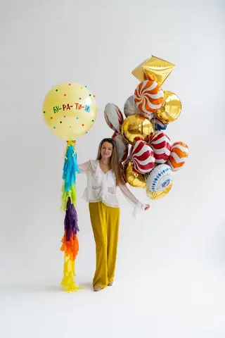 • Разнообразие форм: в композиции гармонично сочетаются шары разных форм — круглые, ромбовидные, в виде леденцов, полумесяца. Это создаёт ощущение движения и лёгкости, будто шары парят в воздухе, подчиняясь невидимому цирковому дирижёру.