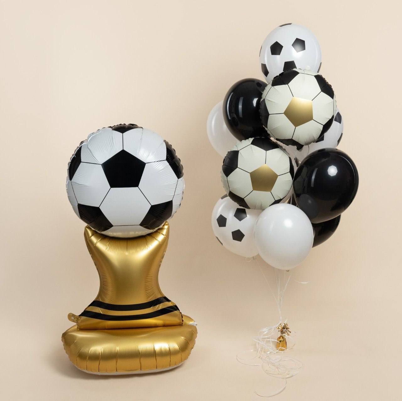 На изображении представлена праздничная композиция из воздушных шаров на футбольную тематику.