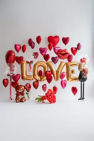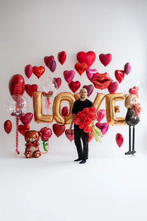 В центре композиции — величественная надпись «LOVE» из блестящих золотых шаров. Она словно сияет на фоне нежных оттенков, задавая тон всей композиции. Вокруг неё — россыпь воздушных сердец в насыщенных оттенках красного и розового, будто лепестки роз, закружившиеся в танце.