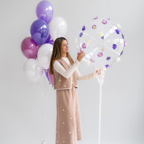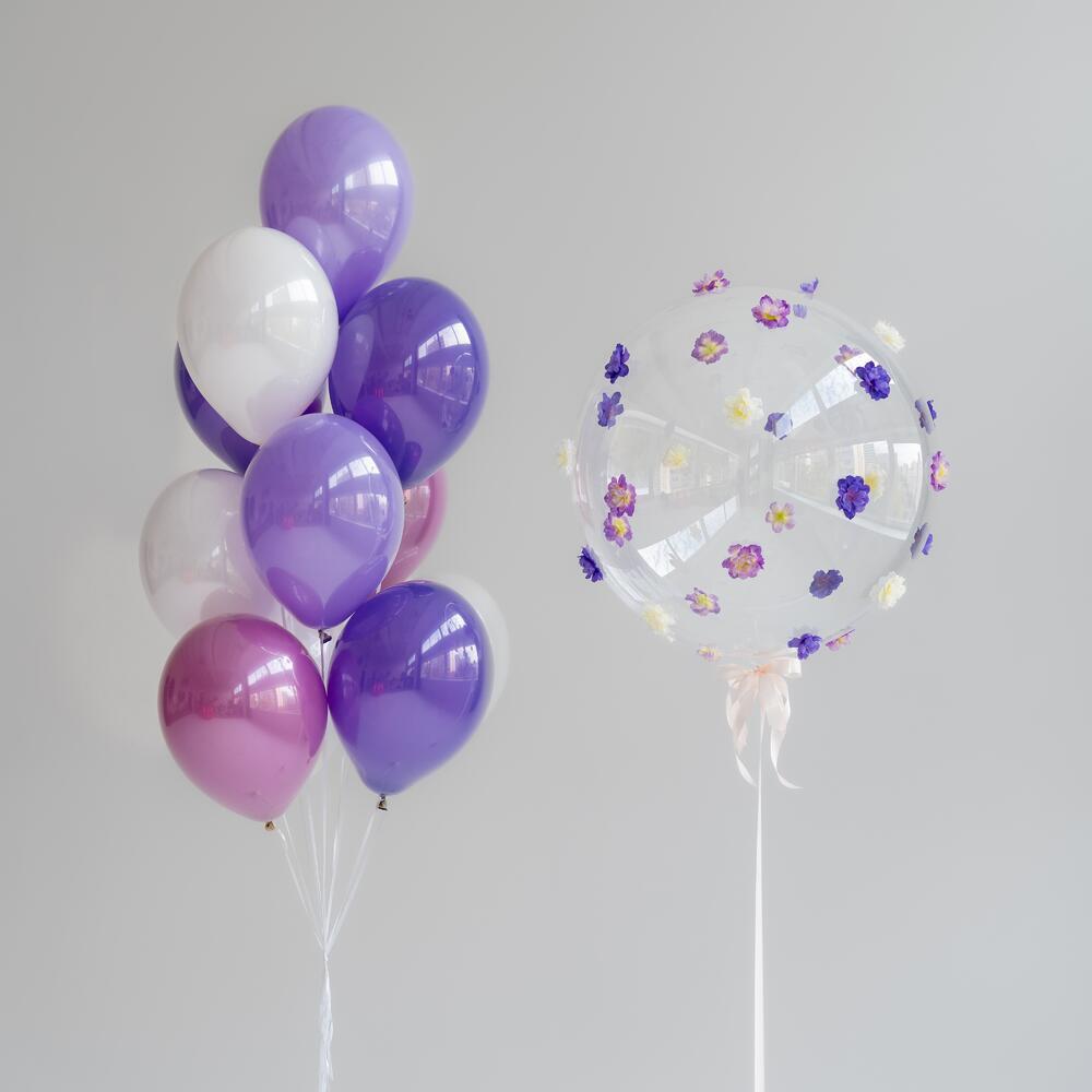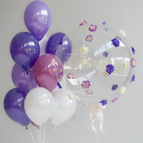 Главный акцент — большой прозрачный шар‑бабл с мини‑цветами и атласным бантом, вокруг — облачко латексных шаров лавандовых, фиолетовых, белых и пыльной‑розы оттенков.