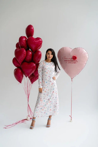 Слева — букет из 9–10 фольгированных шаров в форме сердец насыщенного красного цвета. Шары собраны в «фонтан», перевязаны тонкими лентами, что создаёт эффект пышного букета. Такая композиция выглядит ярко и празднично.