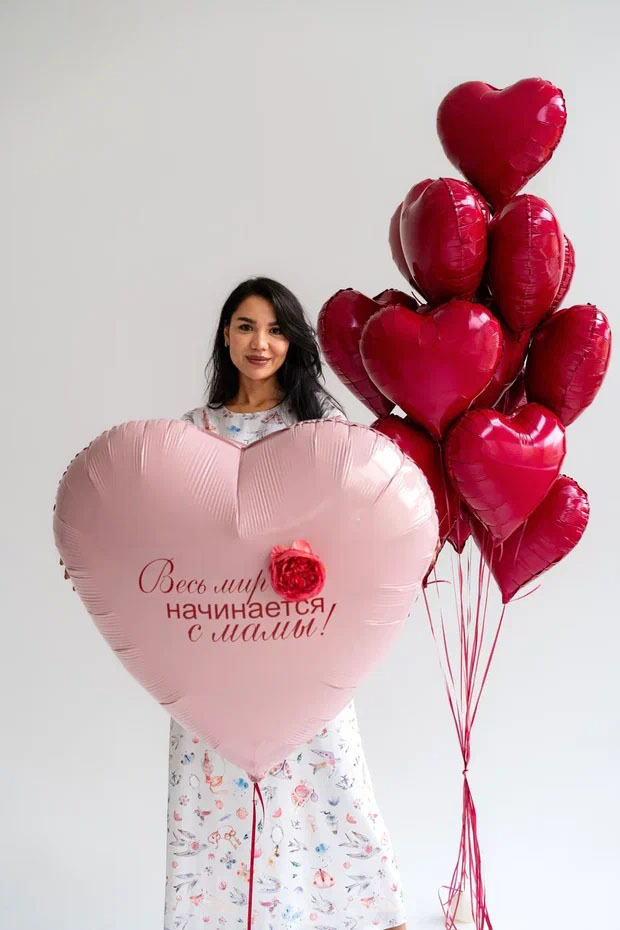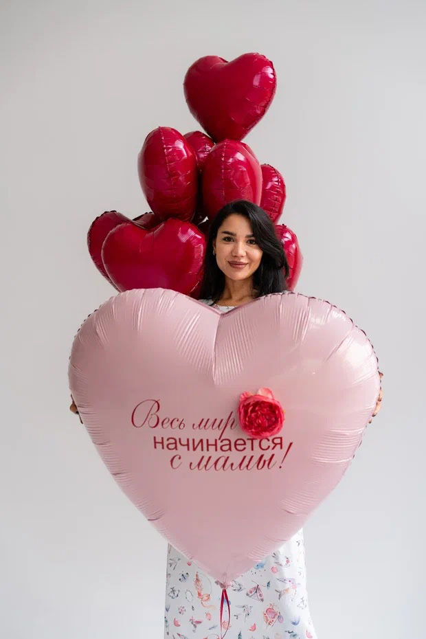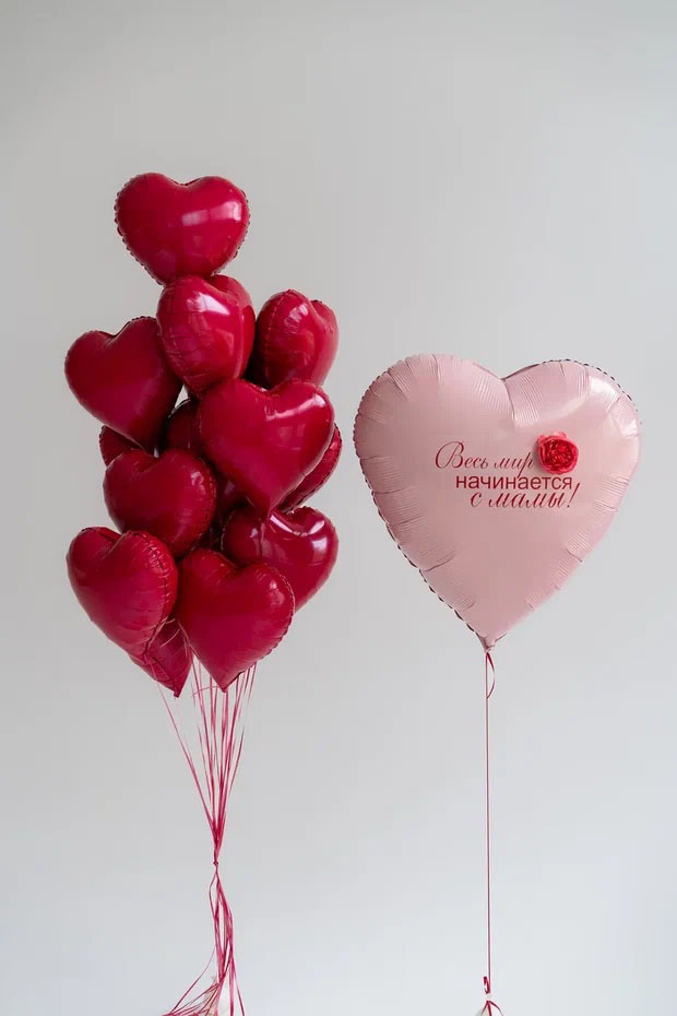 Справа — один крупный фольгированный шар в форме сердца нежно-розового цвета. На шаре размещена надпись: «Весь мир начинается с мамы!» — тёплое признание значимости мамы.