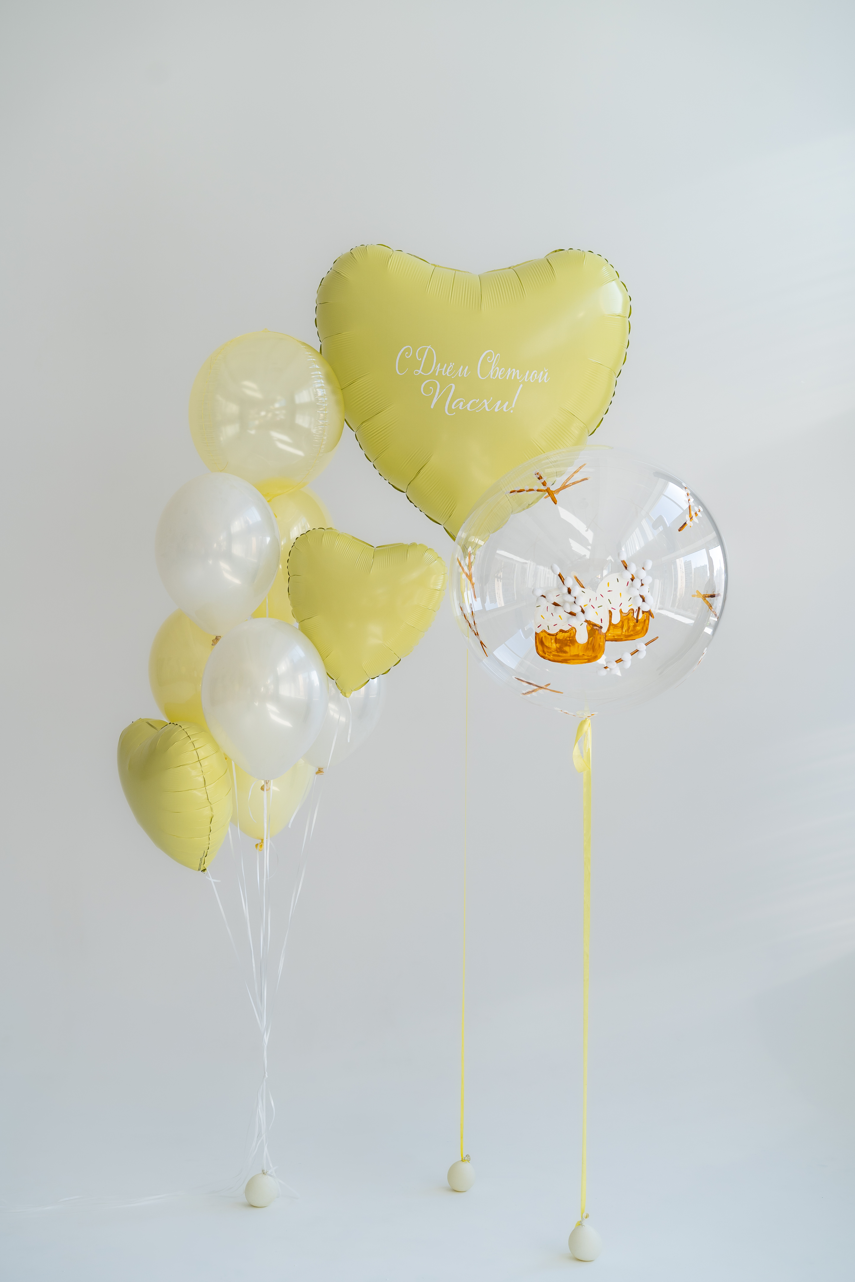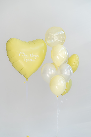 Светло-желтая композиция разделена на две части: отдельно на грузике и связку на белой ленте. Обе части гармонично дополняют друг друга и создают яркое праздничное настроение. Отдельно на грузике: баблс с росписью (1 шт) большая фигура фольга сердце лайм (1 шт) наклейка (1 шт) лента под шар: нежно-желтая с бантиком В связку, лента белая: желтый баблс (1 шт) даблстафф нежно-желтый (3 шт) даблстафф белый металлик (3 шт) средняя фигура фольга сердце лайм (2 шт)