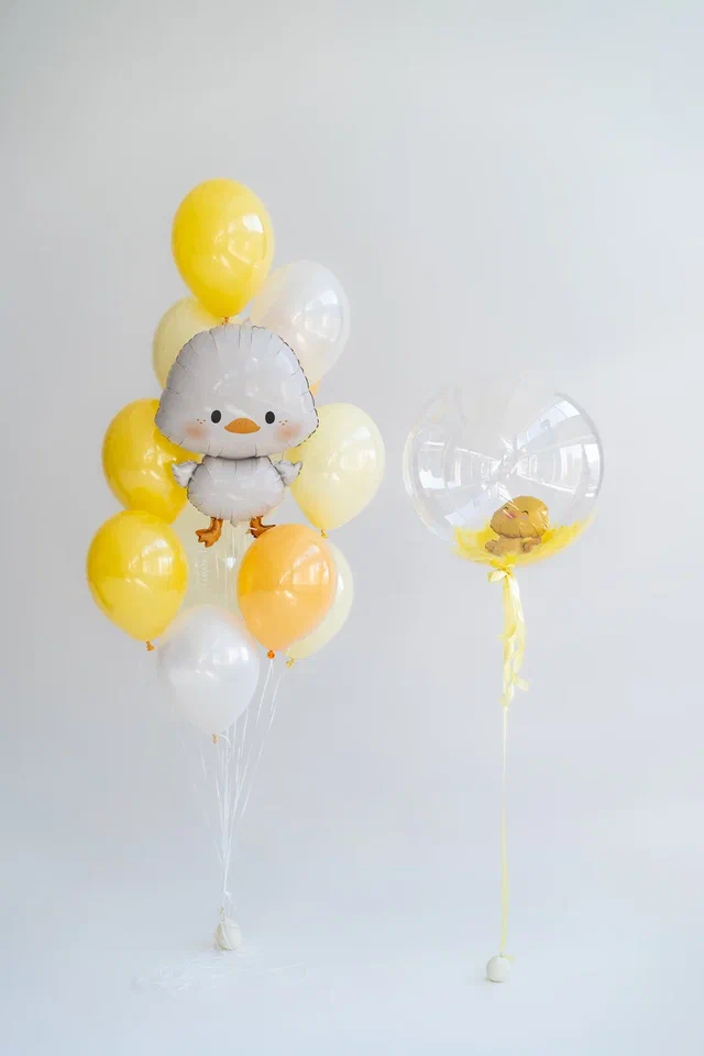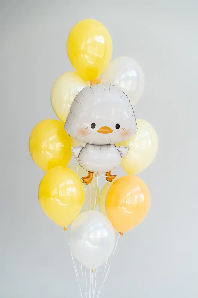 В связку входят 13 стандартных стеклянных шаров и декоративный утёнок, создающие нежное воздушное облако для фотосессий и праздников.