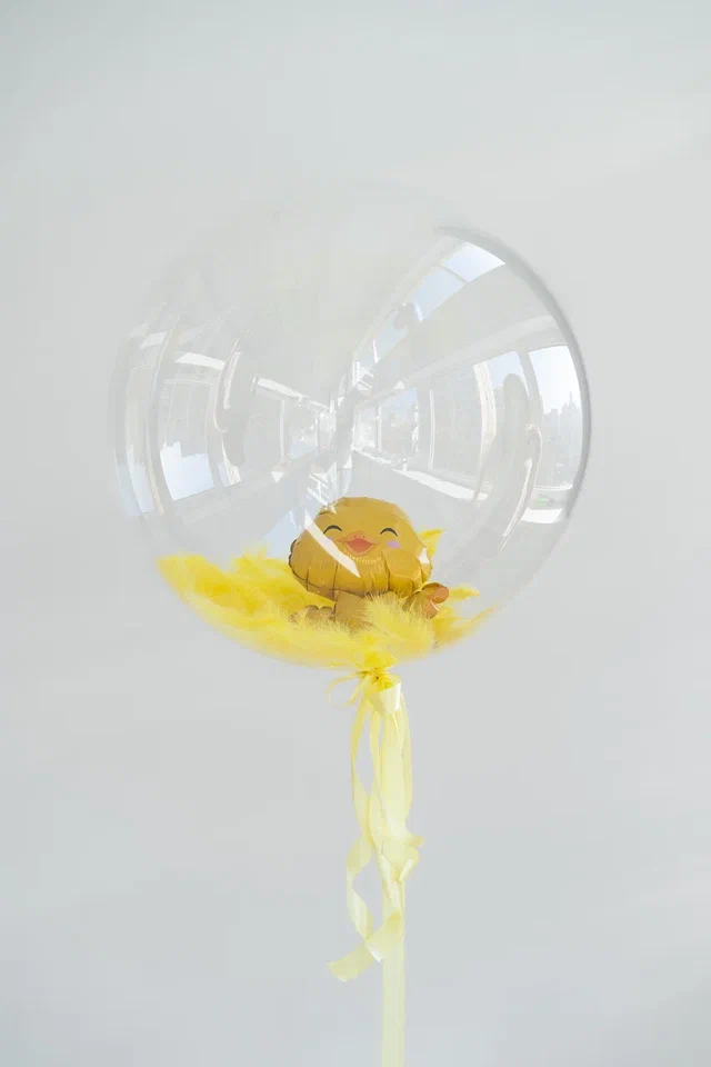 Светлая и милая композиция в желто-бежевых тонах. Отдельно на грузик расположен баблс с цыпленком внутри и перьями, который добавляет милый акцент и динамику всей конструкции.