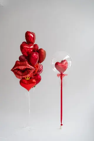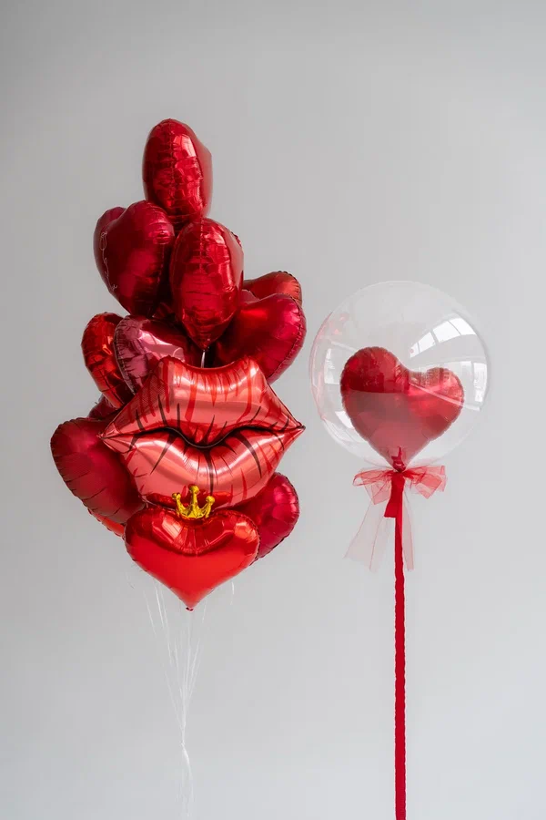 В центре внимания — пышный букет из блестящих красных фольгированных шаров в форме сердец. Их насыщенный алый цвет словно излучает тепло и нежность, создавая атмосферу романтики и искренних чувств. Среди сердечек выделяется эффектный шар в виде соблазнительных губ — символ страсти, поцелуя и трепетного внимания. А миниатюрная золотая корона, украшающая композицию, придаёт ей нотку игривой элегантности, намекая на то, что адресат этого подарка — настоящий король или королева вашего сердца.