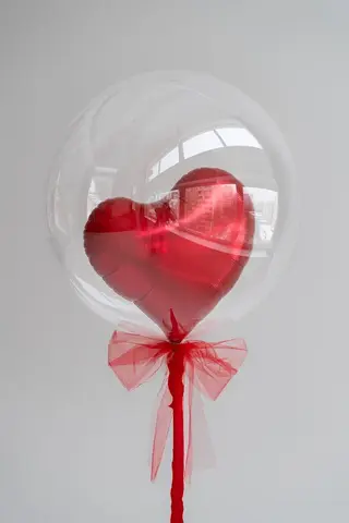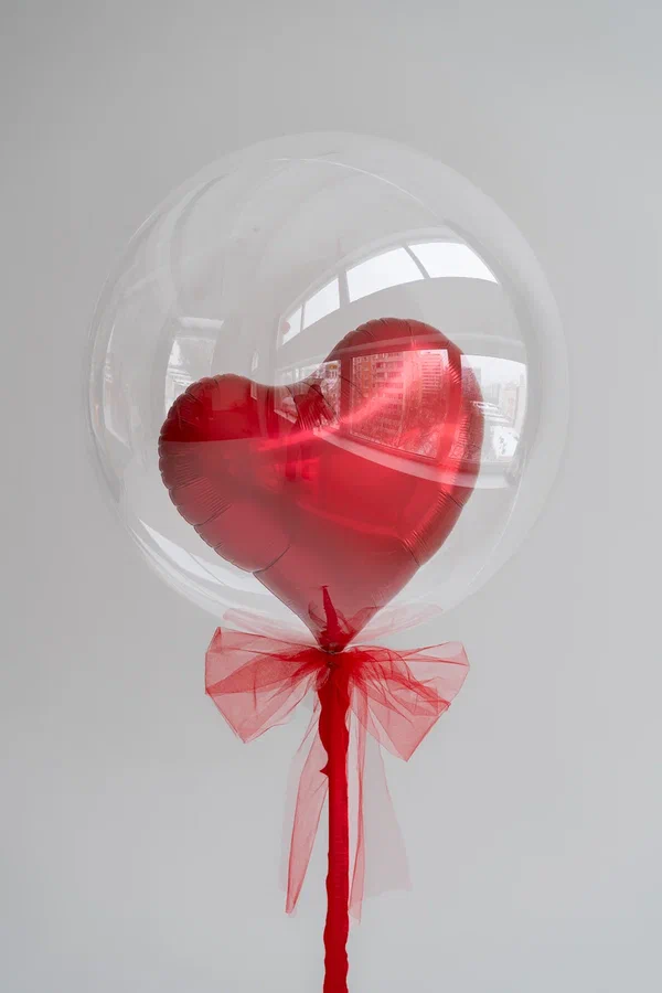 Особого внимания заслуживает изящный прозрачный шар-бабл с алым сердцем внутри. Его лёгкость и воздушность прекрасно контрастируют с насыщенностью основного букета. Нежная розовая лента, аккуратно завязанная бантом, добавляет композиции утончённости и завершённости.