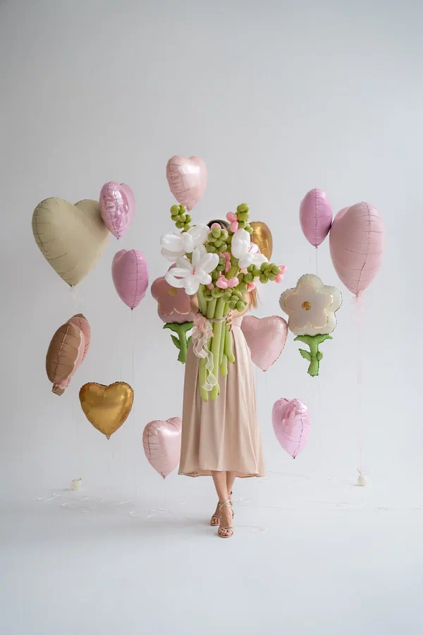 Шары в форме сердец— выполнены в пастельных тонах: нежно-розовом, бежевом и золотистом. Сердечки разного размера, что создаёт ощущение лёгкости и воздушности. Золотистые шары добавляют композиции нотку роскоши и праздничности.