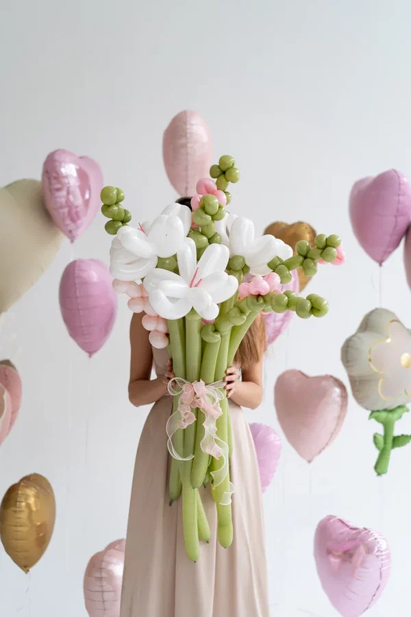 В центре композиции — изысканный букет, выполненный из воздушных шаров, имитирующих живые цветы. Букет выглядит очень реалистично: «цветы» белого и нежно-розового оттенков дополнены зелёными «стеблями» и «веточками», что создаёт эффект свежести и натуральности. Композиция объёмная, с разной длиной «стеблей», что придаёт ей динамику и глубину.