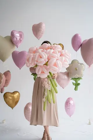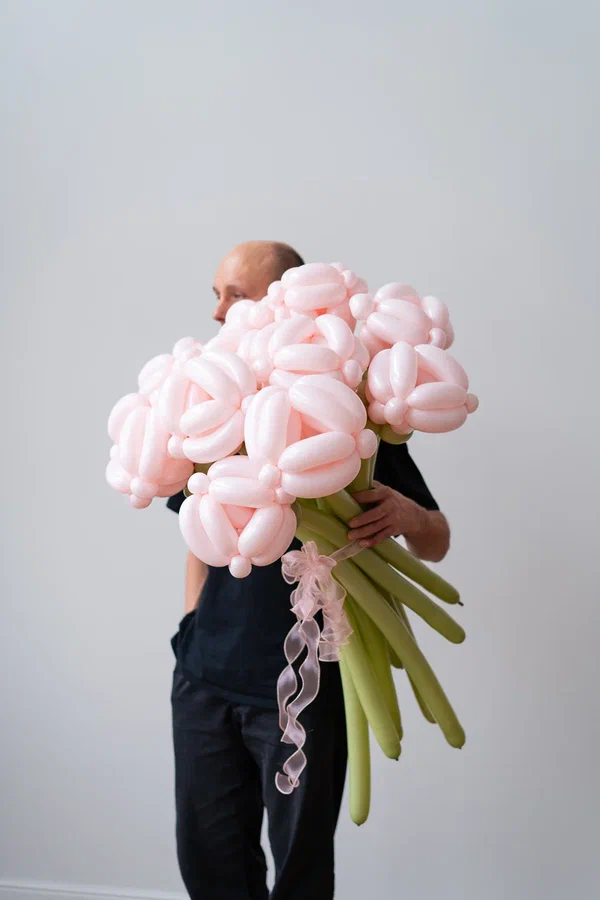- Букет из шаров: состоит из множества скрученных шаров пастельно-розового оттенка, собранных в объёмные «цветы». Зелёные «стебли» добавляют композиции натуральности. Букет выглядит массивно и эффектно, идеально подходит для фотосессий или в качестве подарка.