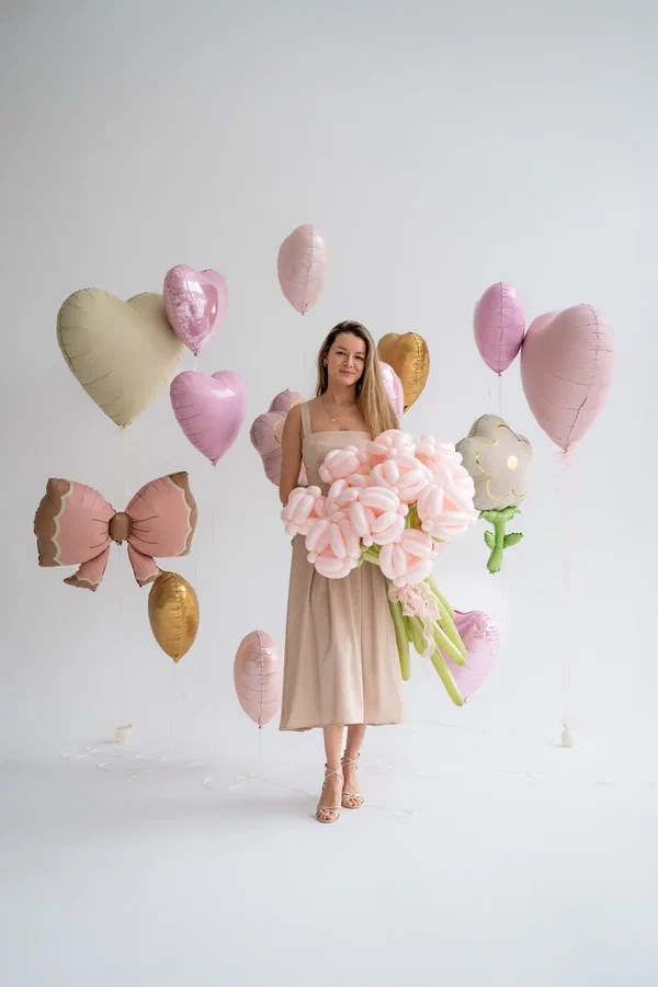 - Шары-цветы: отдельные шары, стилизованные под цветы, дополняют общую картину, усиливая цветочную тематику.