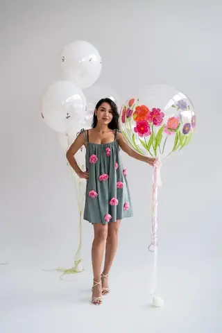 Представляем изысканный сет воздушных шаров, который превратит любой день в праздник! Центральным акцентом композиции стал огромный прозрачный шар, украшенный яркой акварельной росписью с пышным букетом цветов — сочные оттенки розового, оранжевого и фиолетового создают ощущение весеннего сада.