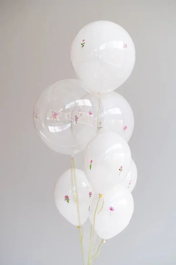 5 стандартных белых шаров даблстафф, также декорированных цветочными наклейками, дополняющих общую гармонию и утонченность композиции.
