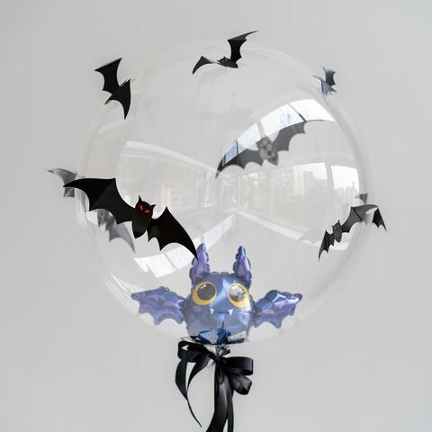 1 баблс-шар расписной с летучими мышами — прозрачный шар с ярким узором и мини-мышками внутри, создаёт иллюзию полёта.