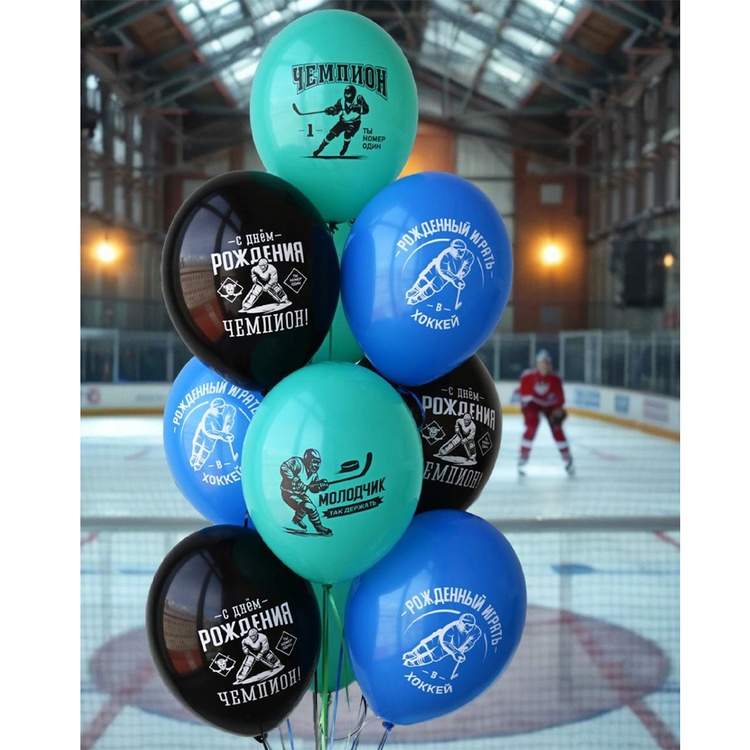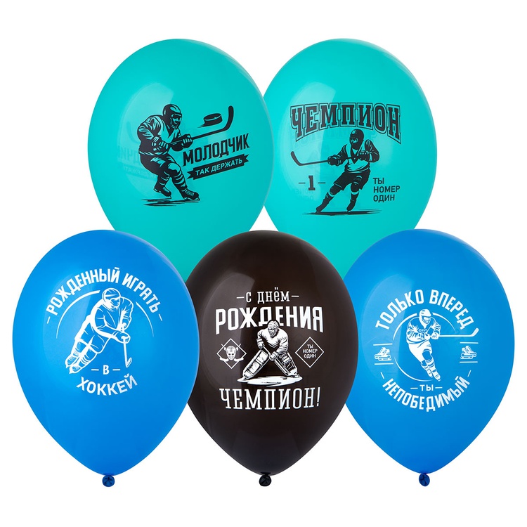 Высококачественный шар из натурального латекса. Пастель - матоввые шары, с двухсторонним шелкографическими текстовыми рисунками, с большим полем печати: С Днем Рождения Чемпион. Рожденный играть в хоккей. Только в перед. Ты неопбедимый. Молодчик - так держать. Чемпион - Ты номер 1..