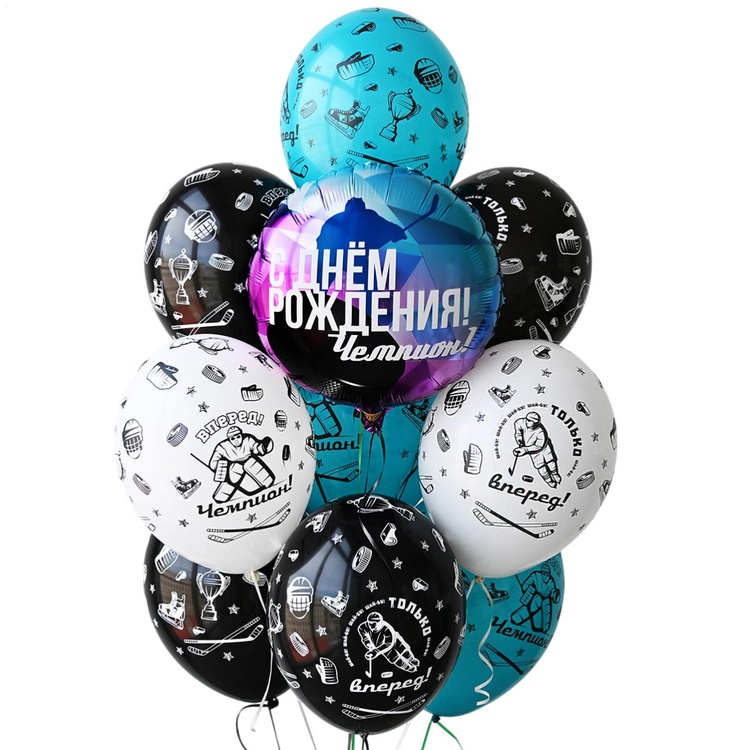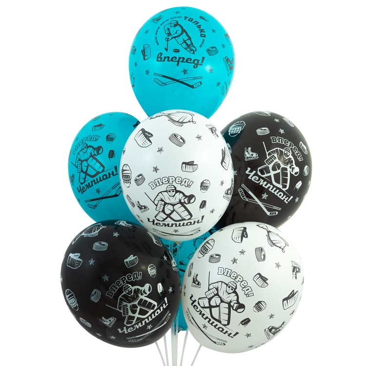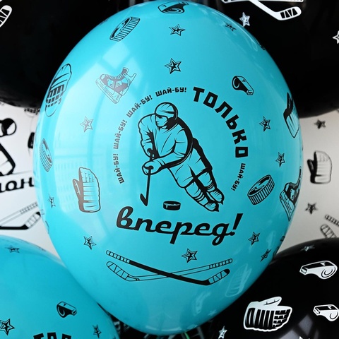 Высококачественный шар из натурального латекса. Одного типа - пастель. Шары с пятисторонним - круговая печать, шелкографическим рисунком на тему Хоккей. Только вперед! Вперед чемпион!