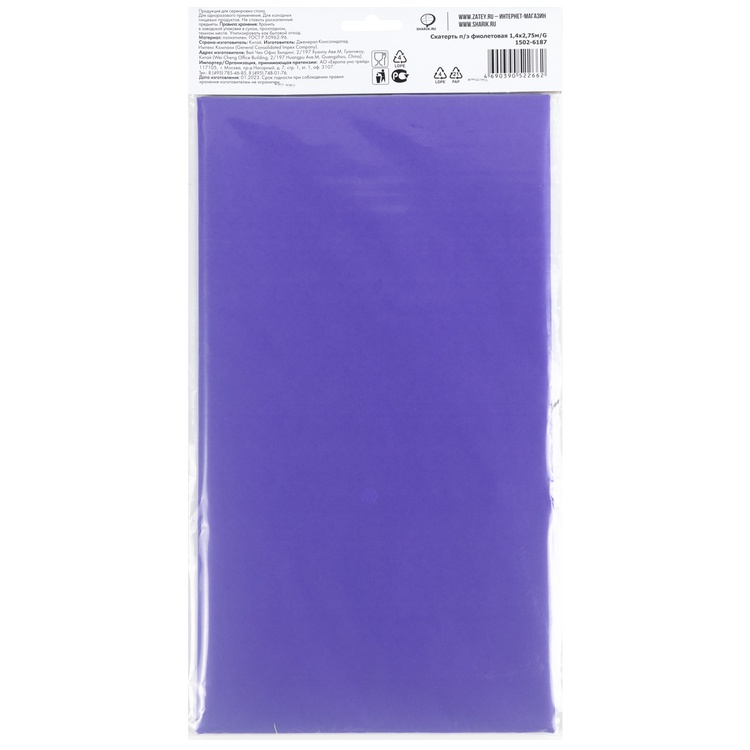 Обратный звонокОднотонная фиолетовая скатерть - используется совместно с другими элементами коллекции по дизайну (тарелки, стаканы, приборы и т.п.) как украшение стола или по своему непосредственному назначению.
