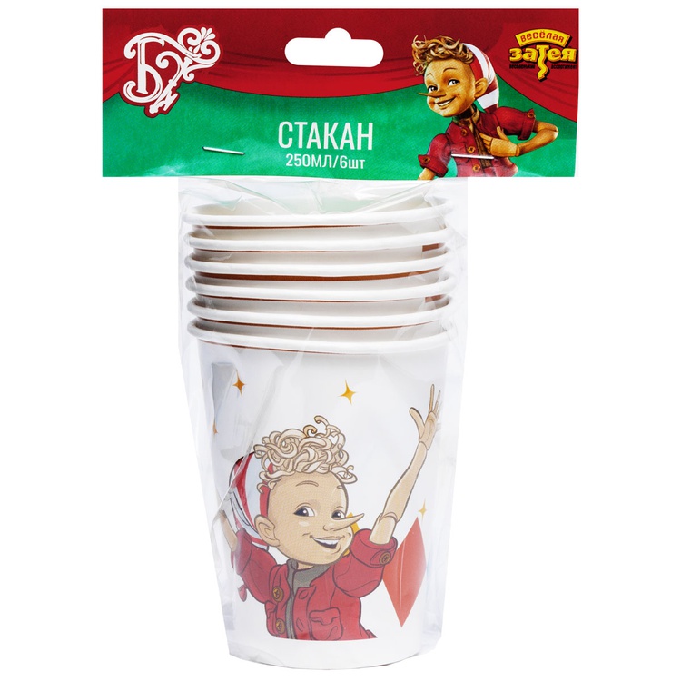 Классика детской литературы — Буратино теперь и на посуде! Яркие и красочные одноразовые стаканы с изображениями любимых героев сказки создадут атмосферу настоящего праздника, в которой каждый ребенок почувствует себя частью волшебного приключения. В наборе 2 дизайна. Стаканы изготовлены из мелованного картона. Подходит для холодных и горячих напитков до 90°С Не допускается соприкосновение изделий с окислителями, щелочами и кислотами. В упаковке 6 ламинированных бумажных стаканов. 250мл.