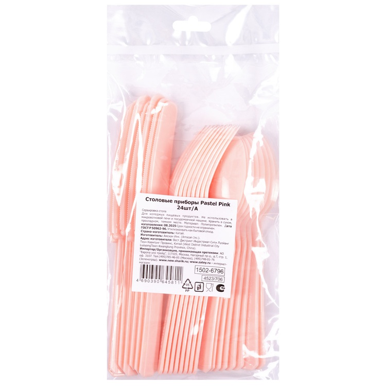 Обратный звонокКомплект одноразовых вилок, ложек и ножей пастельного розового цвета. Облегчают жизнь хозяйки и украшают праздничный стол на вечеринке, свадьбе, пикнике или фуршете. Используется совместно с другими элементами коллекции по дизайну (тарелками, стаканами, салфетками и скатертями). Приборы изготовлены из качественной пищевой пластмассы, безопасны в использовании. Столовые приборы пастельного розового цвета вы можете купить в нашем интернет-магазине.
