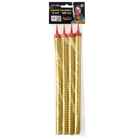 Свеча-Фонтан – очень зрелищный и эффектный способ наполнить ваш праздник ярким фейерверком эмоций! Уникальное и универсальное изобретение, которое превратит любое событие: День Рождения, Новый год, свадьбу, корпоративную вечеринку в незабываемое торжество. Свеча-Фонтан может использоваться как самостоятельно, так и в сочетании с классическими свечами для торта. Для установки в торт или любое другое кондитерское изделие в каждом фонтане предусмотрена пластмассовая пика. Высота свечи 25см, время горения до 60 секунд, в упаковке 4 штуки. Несмотря на то, что продукция по принципу работы схожа с бенгальскими огнями (производит пламя с низкой температурой горения), пожалуйста, не забывайте соблюдать базовые правила безопасности!