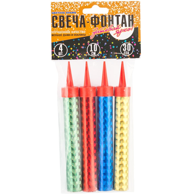 Свеча-Фонтан – очень зрелищный и эффектный способ наполнить ваш праздник ярким фейерверком эмоций! Уникальное и универсальное изобретение, которое превратит любое событие: День Рождения, Новый год, свадьбу, корпоративную вечеринку в незабываемое торжество. Свеча-Фонтан может использоваться как самостоятельно, так и в сочетании с классическими свечами для торта. Для установки в торт или любое другое кондитерское изделие в каждом фонтане предусмотрена пластмассовая пика. Высота свечи 10 см, время горения 30 секунд, в упаковке-блистере 4 штуки. У каждой свечи свой цвет пламени - синий, красный, желтый, зеленый. Несмотря на то, что продукция по принципу работы схожа с бенгальскими огнями (производит пламя с низкой температурой горения), пожалуйста, не забывайте соблюдать базовые правила безопасности!