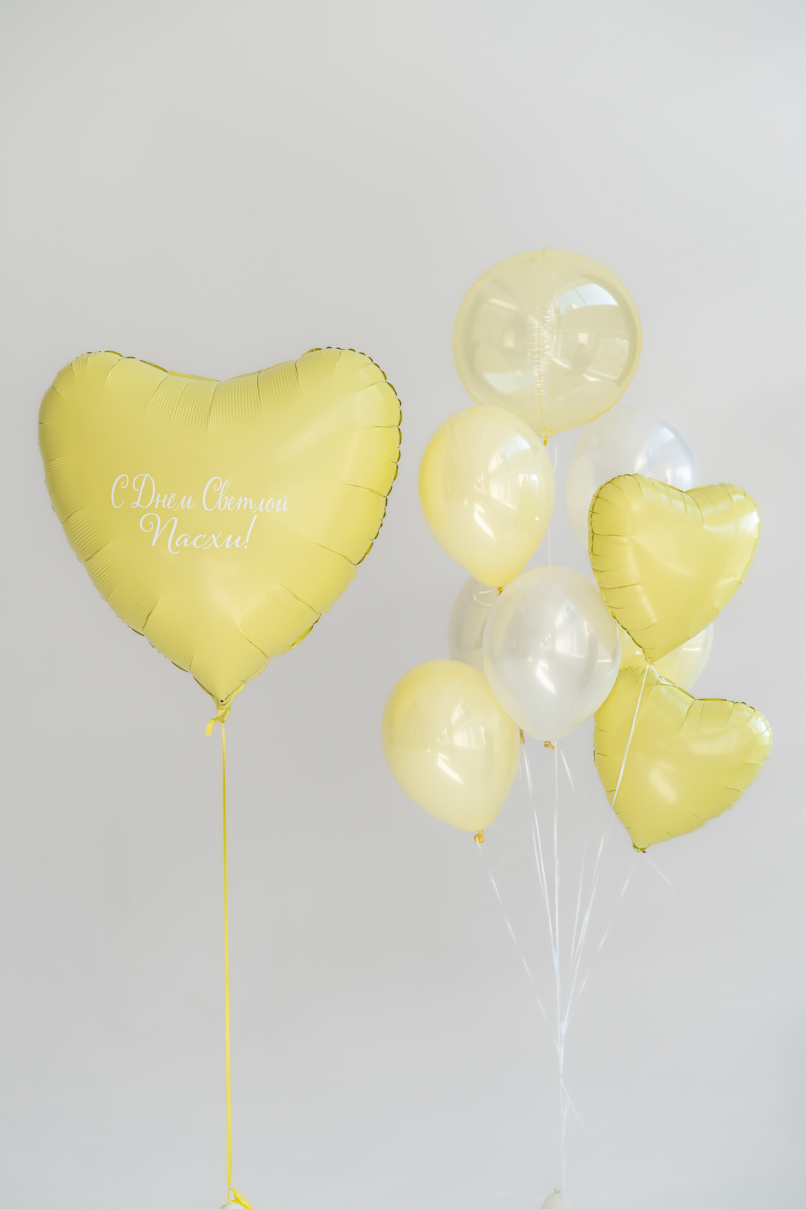 Эта нежно-желтая композиция состоит из двух частей: отдельно на грузике и связки на белой ленте. Обе части гармонично дополняют друг друга, создавая светлое и радостное настроение. Центральный акцент — большая фигура фольги в форме сердца лаймового оттенка, украшенная аккуратной наклейкой. Лента под шар на грузике выполнена из нежно-жёлтой ткани с бантиком, добавляющим милый и деликатный штрих.