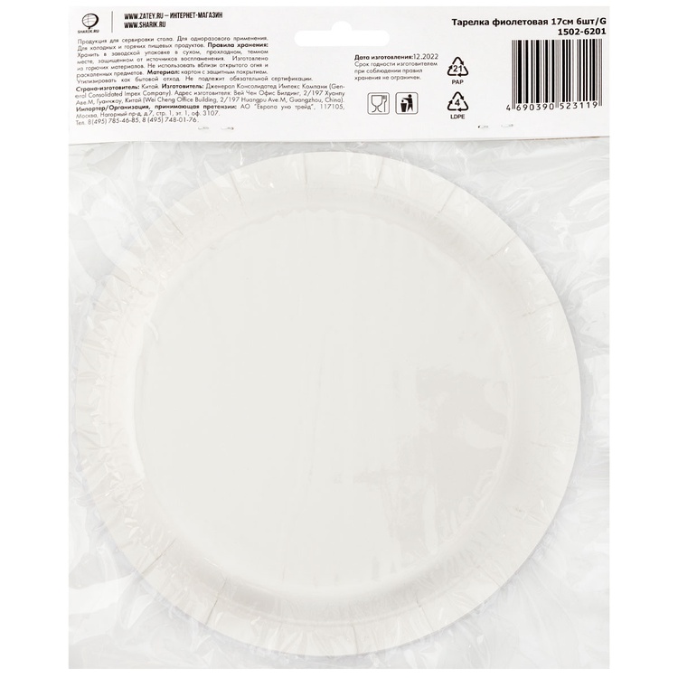 Обратный звонокФиолетовая бумажная тарелка, 17см, 6 штук в упаковке. Используется совместно с другими элементами коллекции как украшение стола или по своему непосредственному назначению.