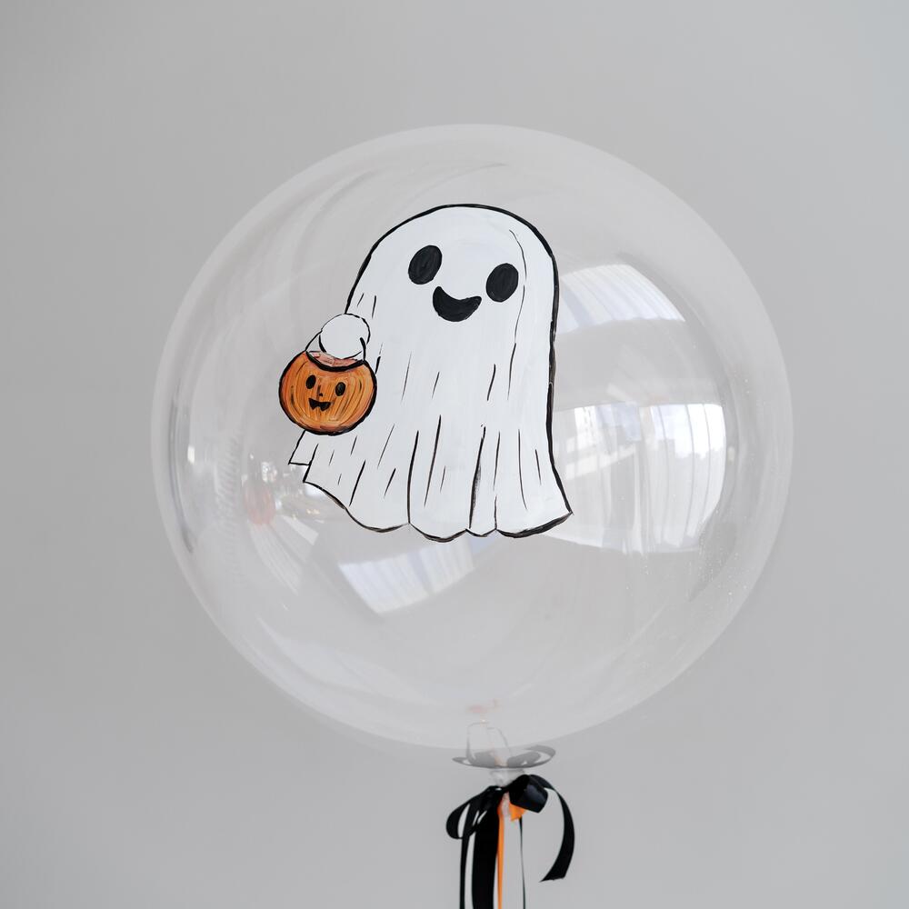 Хэллоуинский Баблс Шар Улыбающееся Привидение с Тыквой Добавьте нежной мистики и милого ужаса в ваш Хэллоуин с этим очаровательным баблс-шаром! Представьте: прозрачный шар, внутри которого парит дружелюбное привидение — белый силуэт с чёрными глазами и широкой улыбкой, держащий в ручках классическую оранжевую тыкву. Это не просто декор, а полноценный элемент праздника: лёгкий, воздушный и идеально подходящий для фотозон, столов или гирлянд. Надут гелием, он будет медленно парить, создавая иллюзию летающего духа из другого мира. Минималистичный дизайн в чёрно-белых тонах с ярким оранжевым акцентом — для тех, кто любит Хэллоуин без излишней жути, но с кучей шарма! Почему этот баблс-шар — идеальный выбор для Хэллоуина? Милый и пугающий баланс: Улыбающееся привидение с тыквой добавляет юмора и тепла