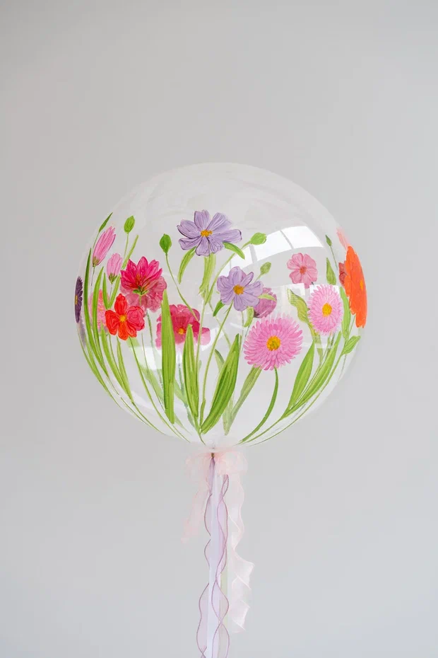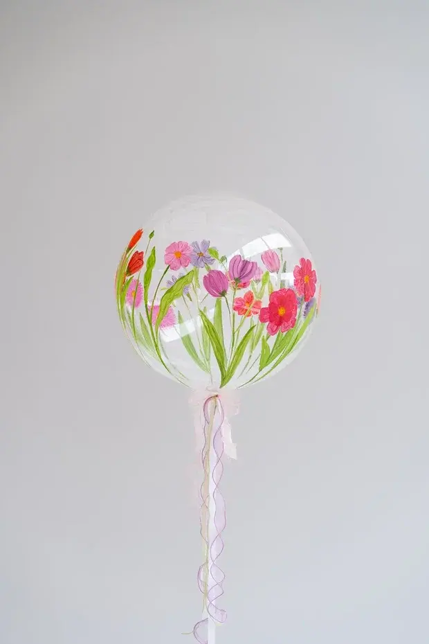 На изображении представлен прозрачный воздушный шар, украшенный художественной росписью в виде цветочной композиции.