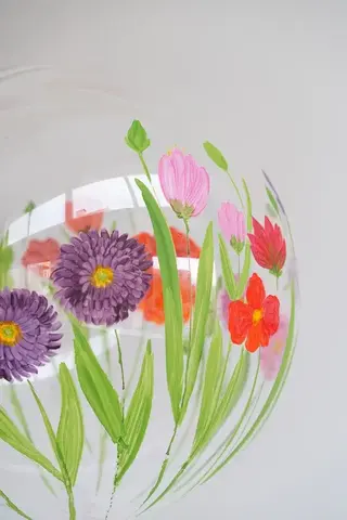 Роспись: на поверхности шара изображены разнообразные цветы и зелёные стебли, выполненные в акварельной технике.