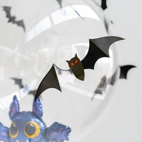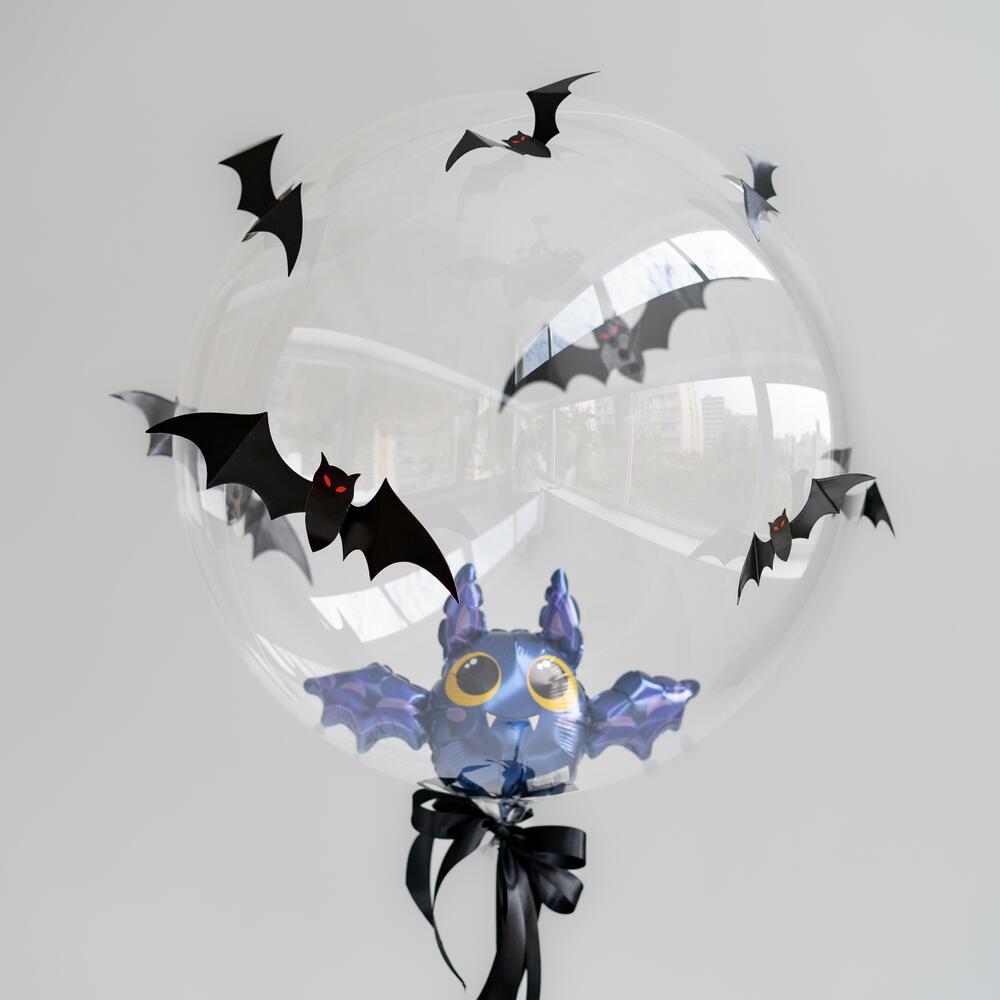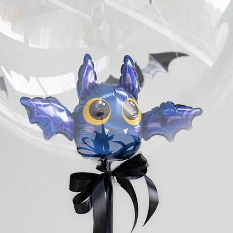 Воздушный шар Баблс для Хеллоуина Стая Летучих Мышей Пусть ночь Хэллоуина наполнится таинственным шорохом крыльев с этим волшебным баблс-шаром Стая Летучих Мышей! В прозрачном шаре парит стая чёрных силуэтов летучих мышей, а в центре — яркая синяя мышь с большими выразительными глазами, словно она следит за всеми гостями. Это идеальное воплощение ночной мистики: мыши кажутся живыми, парящими внутри, добавляя динамики и лёгкого озноба. Надутый гелием, шар грациозно висит в воздухе, создавая атмосферу загадочного полёта. Отличный выбор для вечеринок, декора окон или фотозон — превратите пространство в логово ночных существ!